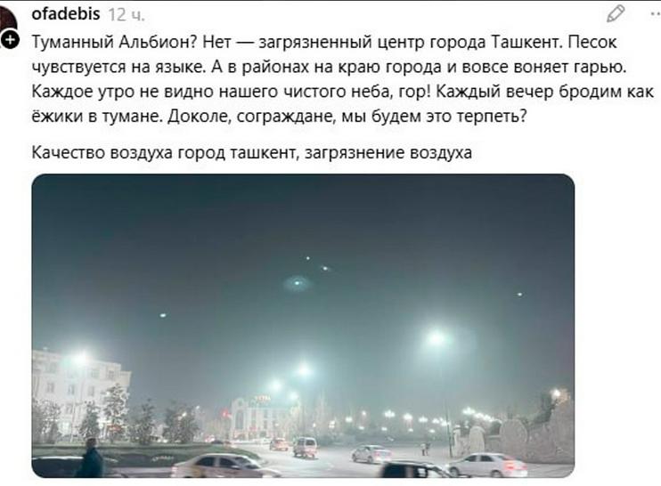 Жумладан, 20 ноябрь куни автоматик мониторинг станциялари маълумотларига кўра, Тошкент ҳавосидаги майда заррачалар (РМ10) даражаси кубометр учун 299 микрограммни ташкил этган, бу рухсат этилган максимал концентрациядан (300 мкг/м³) ошмаган. Бироқ, РМ2.5 даражаси 202 мкг/м³ га етган, бу стандартдан 3,4 баравар (60 мкг/м³) юқори.