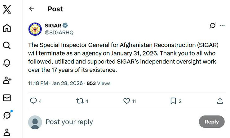 «Афғонистонни қайта тиклаш бўйича махсус бош инспектор идораси (SIGAR) 2026 йил 31 январда фаолиятини тўхтатади. SIGARнинг 17 йиллик фаолияти давомида мустақил назорат ишларини кузатиб борган, унинг ресурсларидан фойдаланган ва идорани қўллаб-қувватлаган барчага миннатдорчилик билдирамиз», — дейилган постда.