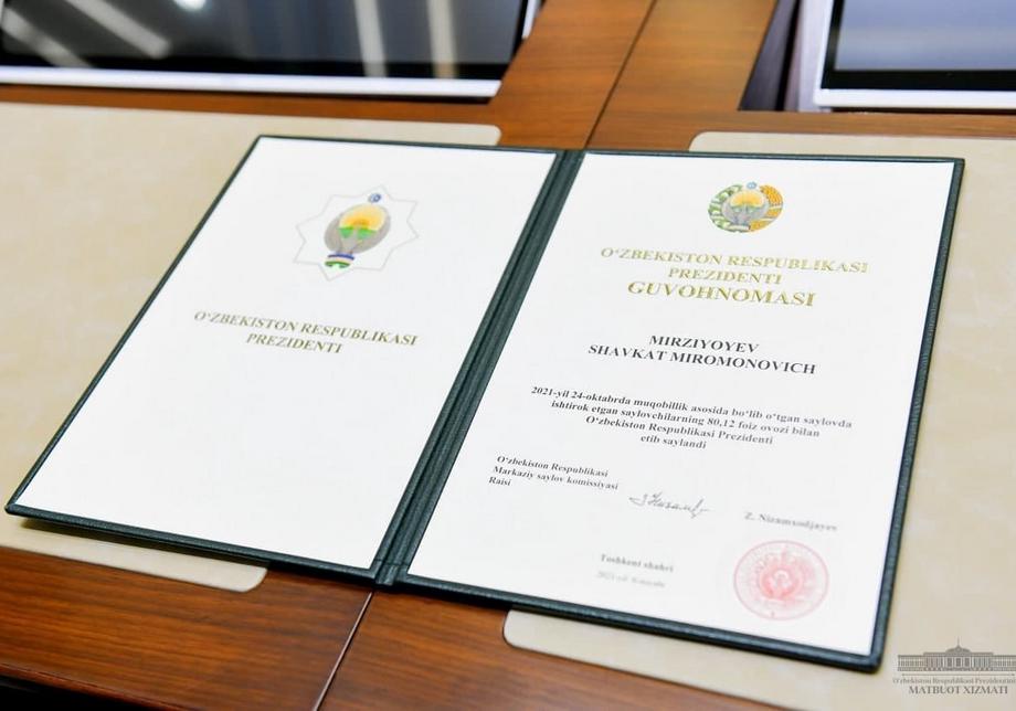 Марказий сайлов комиссияси раиси Зайниддин Низомходжаев Мирзиёевга Ўзбекистон Республикаси Президенти гувоҳномасини топширди. Сўнг Шавкат Мирзиёев Ўзбекистон Конституцияси ва Қуръони Каримга қўлини қўйган ҳолда қасамёд қилди.