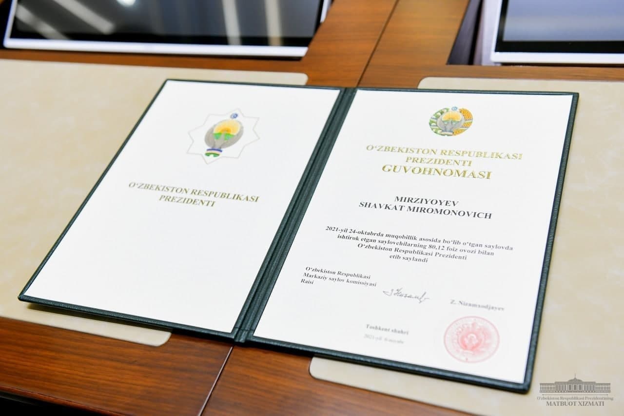 Марказий сайлов комиссияси раиси Зайниддин Низомходжаев Мирзиёевга Ўзбекистон Республикаси Президенти гувоҳномасини топширди. Сўнг Шавкат Мирзиёев Ўзбекистон Конституцияси ва Қуръони Каримга қўлини қўйган ҳолда қасамёд қилди.