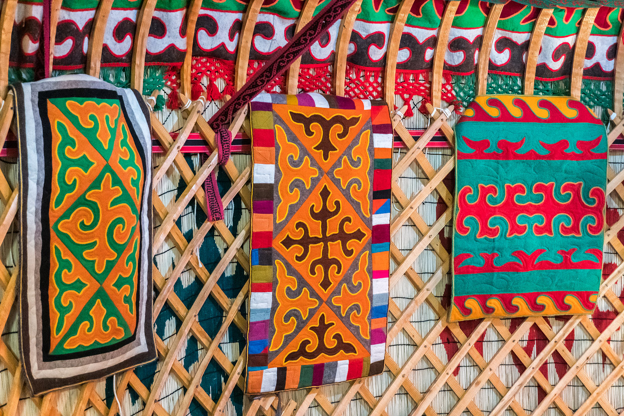 Ўтов деворлари ҳайвон териси, мураккаб нақшли бўйра, кигиздан тикилган кашта ва бошқа безак буюмлари билан безатилган. Ҳар бир элементнинг ўз ўрни ва алоҳида маъноси бор. Анъанавий нақшлар кундалик ҳаётда кўчманчиларни ўраб турган тоза табиатнинг ёрқин ранглари ва шаклларидан илҳомланиб яралган.