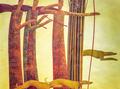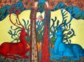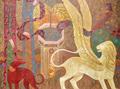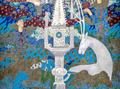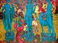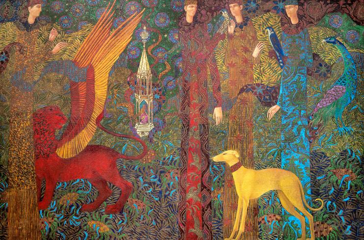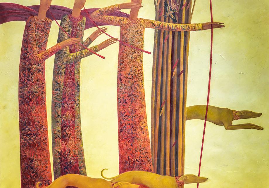 Бундай идрокка зиғир матосига қаттиқ чўтка уришларнинг ноёб техникаси ва ўта ёрқин рангларнинг контрастли палитраси туртки беради. Узоқдан қараганда, расмлар мозаика ёки ўрта аср гобеленларига жуда ўхшаш кўринади, лекин яқиндан улар замонавий безак лабиринтларига айланади.